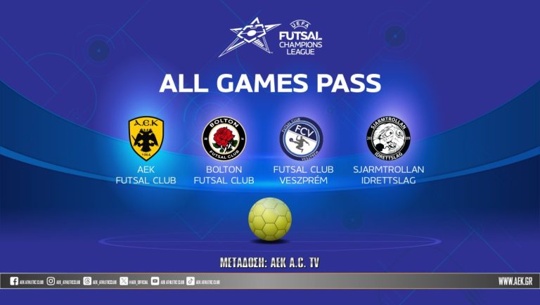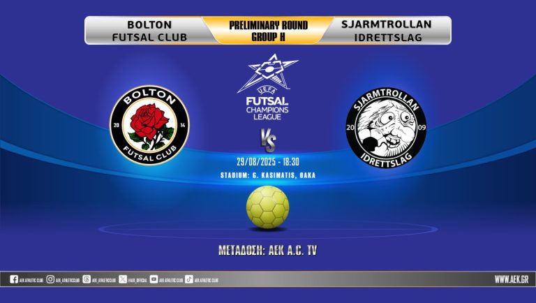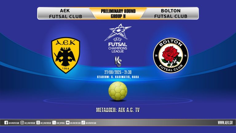 Watch live the match between AEK from Greece and Bolton Futsal Club from England for the Preliminary Round of Group H. The match takes place at “G. Kassimatis” Hall of OAKA, on 27/08, at 21:30.