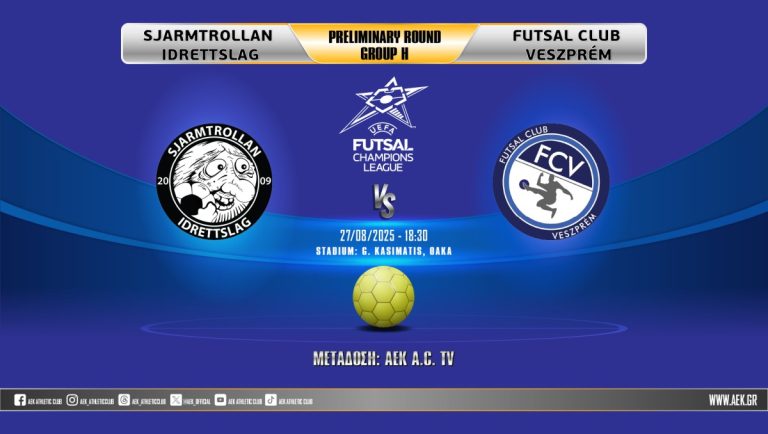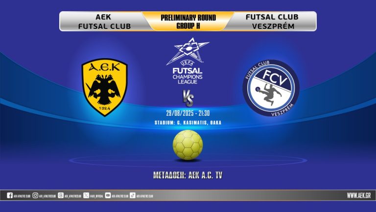 Watch live the match between AEK from Greece and Futsal Club Veszprém from Hungary for the Preliminary Round of Group H. The match takes place at “G. Kassimatis” Hall of OAKA, on 29/08, at 21:30.