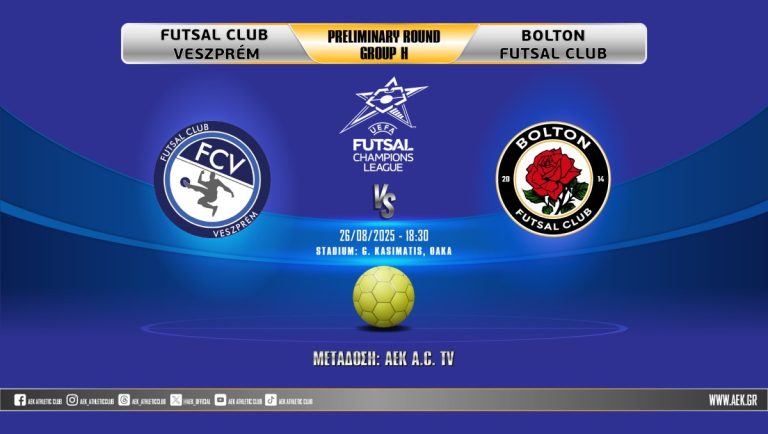 Watch live the match between Futsal Club Veszprém from Hungary and Bolton Futsal Club from England for the Preliminary Round of Group H. The match takes place at “G. Kassimatis” Hall of OAKA, on 26/08, at 18:30.