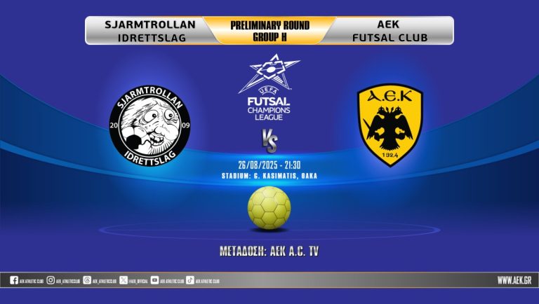 Watch live the match between Sjarmtrollan Idrettslag from Iceland and AEK from Greece for the Preliminary Round of Group H. The match takes place at “G. Kassimatis” Hall of OAKA, on 26/08, at 21:30.